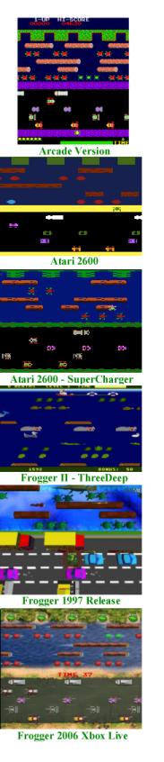 * Frogger has had many official sequels (and even more un-official clones, knock-offs, and homages). The 1984 release “Frogger II: ThreeDeep” saw our little frogs traverse an underwater world, a lake surface, and even take to the sky. Hasbro released several 3D Frogger versions in the late 1990s, and Konami recently released several Frogger-themed adventure games for the Game Boy Advance. The latest Frogger incarnation can be played on Xbox Live.