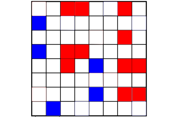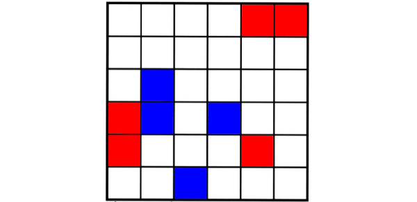 In this puzzle, you need to fill the entire game board with only two colours: red (R) and blue (B). Print out this page (click here for a printable PDF version) and grab a red and blue marker.
