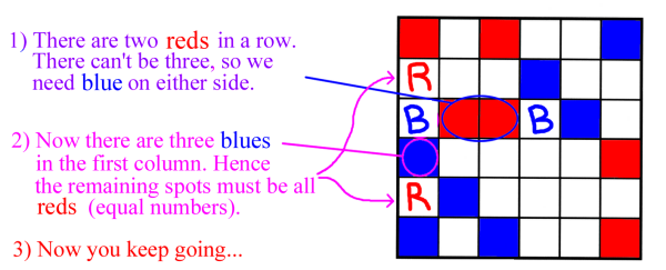 1. You cannot have more than two matching colours together in a row or column. RR is allowed, RRR is not!