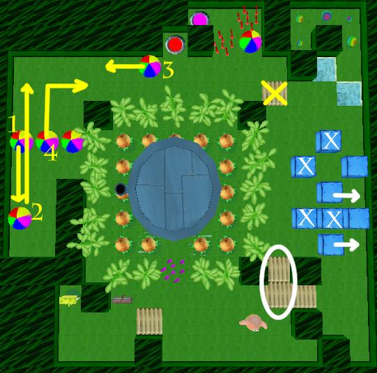Switch to SpongeBob and push the beachballs along the yellow arrows in the indicated order 1-4. Now Patrick can push the red button. Let SpongeBob use one more beachball to build a bridge to the Bonus Bubbles, then step on the purple button. Switch to Patrick and complete the level (there is another Bonus Bubble in the entrance of the house).