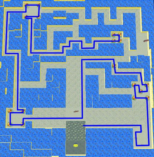 The blue path shows the quickest way through this maze that collects all Bonus Bubbles and Krabby Patties.