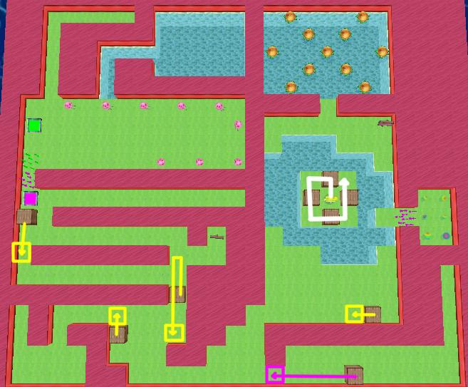 Move along the white path to build bridges in three directions. Then push boxes along yellow paths into the indicated positions. Once the purple button is pressed, rush back to collect the bonus bubbles. Finally, move the box along the purple path and watch the Jelly train pass to collect all of the Krabby Patties.