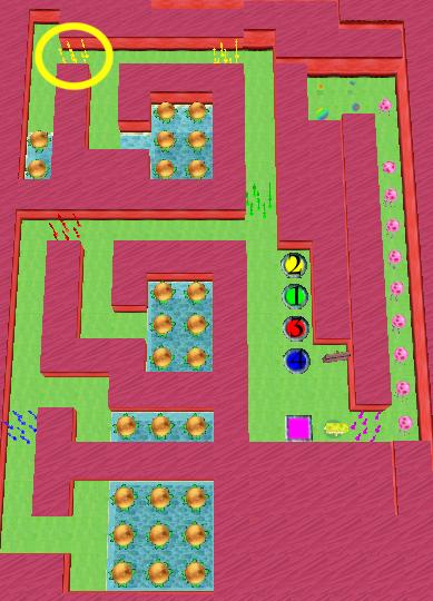 Once the purple button is pressed, you need to use the other seaweed gates to split up the Jellyfish such that at least one Jelly makes it into each area. Step on the green button first, and wait until three Jellyfish have passed the green seaweed, then switch onto the yellow button. Now wait until the middle of these three Jellyfish is on the second yellow seaweed patch (circled) before switching to the red button (this will guide one Jellyfish each into the two upper areas). Once three Jellyfish have safely passed the red gate, step onto the blue button. Again, once the middle of these three Jellyfish is on the blue seaweed patch it is time to step off the button in order to split this group. Now make a dash for the Bonus Bubbles before the Krabby Patties are collected.
