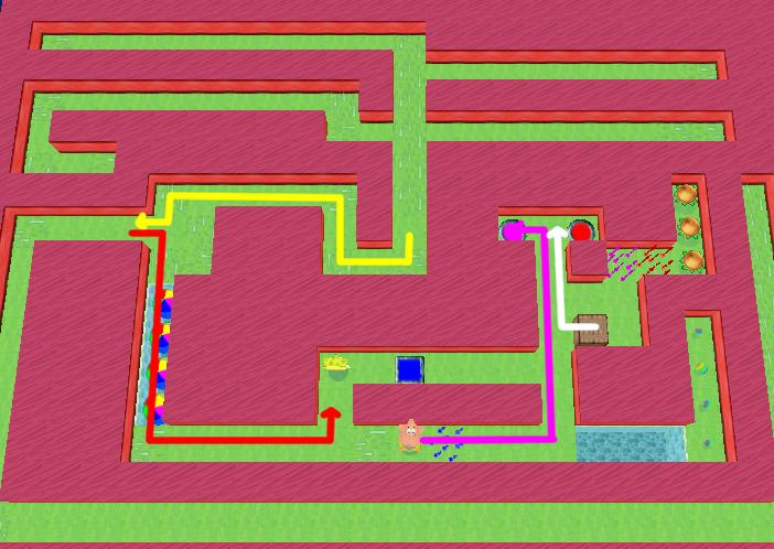You need to move fast on this level. Immediately move SpongeBob along the yellow path, then - as soon as the beachballs have passed - move along the red path. Once SpongeBob is on the blue button, immediately switch to Patrick and move along the purple path. Do this fast enough, and the final set of beachballs will survive and build a bridge to the bonus bubbles.