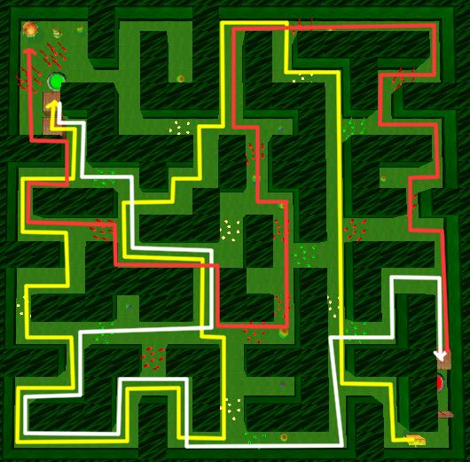 The paths through this maze change as different buttons are pushed. Follow the yellow path to the upper left corner. Deactivate the white and activate the green button with the two boxes. Return along the white path to push the box onto the red button. Now follow the red path back to the Krabby Pattie. Make any required detours to collect Bonus Bubbles along the way.