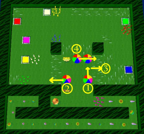 To collect all of the Bonus Bubbles, roll the beachballs in the indicated order to open the purple seaweed gate. Then move SpongeBob into the corridor below, timing your steps with the movement of the tentacles.