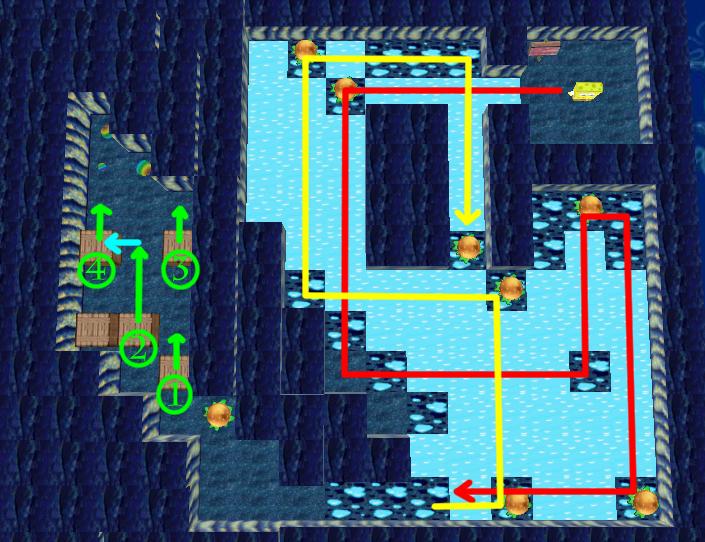 Follow the red path across the ice. To collect Bonus Bubbles, move the boxes along the indicated arrows (green 1-4), then move the central box one step left (blue arrow). Finally, move SpongeBob back to the ice and complete the level along the yellow path.