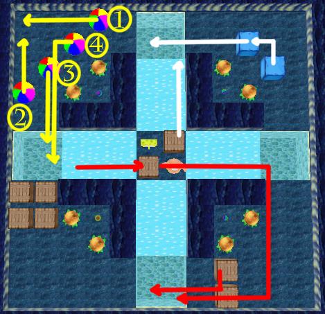 Switch to SpongeBob. Move the beachballs along the indicated paths (1 to 4). Now push the second wood box from the central island along the red path, and finally build a bridge from the bottom-right to the bottom-left corner. Collect all Bonus Bubbles and Krabby Patties.
