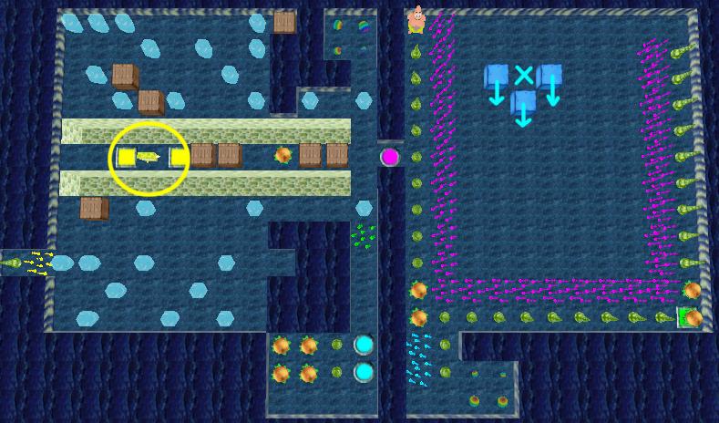 The next part requires patience. Move Patrick to the safe spot ("X") inside the three boxes. Wait until all tentacles fire at the same time, then quickly move the left, then the right, then the center box one step down. Move fast enough, and you'll be back in the safe spot before the tentacles fire again. Repeat, and slowly make your way to the bottom of the level.